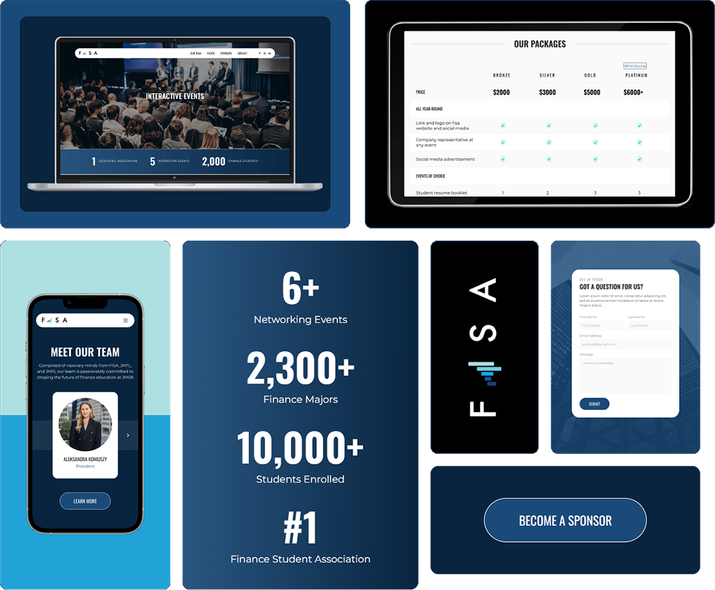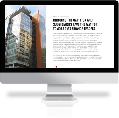 FISA, along with its subsidiaries, the John Molson Trading League (JMTL) and the John Molson Investment Society (JMIS), is dedicated to nurturing the future generation of finance professionals through immersive experiences. To align with their forward-thinking approach, they sought a website redesign, tasking us with revitalizing their online platform with contemporary designs to ensure consistency and resonance with their audience.