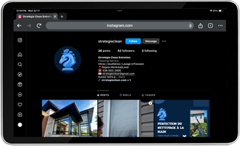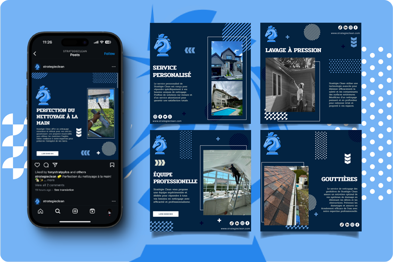 Strategie Clean is a professional window and gutter cleaning service dedicated to maintaining the cleanliness and integrity of residential and commercial properties. They provide thorough and reliable cleaning services that enhance the appearance and longevity of buildings, ensuring that windows are spotless and gutters are free from debris. We assisted Strategie Clean in improving their social media presence by crafting a strategic content plan that included before-and-after visuals, customer testimonials, and maintenance tips. This approach boosted their online engagement, increased brand visibility, and attracted new clients to their services.
